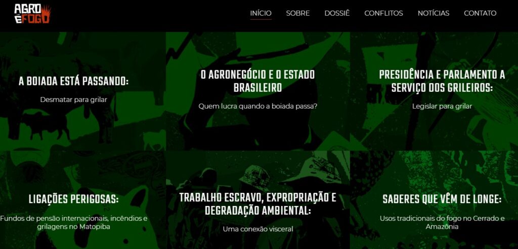 A plataforma agrega análises e denúncias sobre as múltiplas dimensões da devastação ambiental e dos conflitos por terra que se dão no rastro do uso criminoso do fogo pela cadeia do agronegócio, evidenciando a relação intrínseca entre a questão ambiental, agrária e fundiária no Brasil.