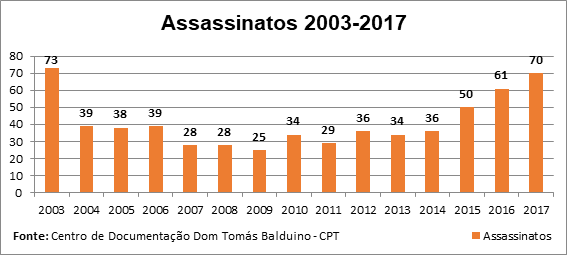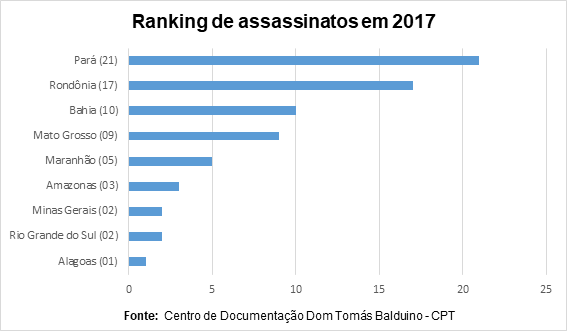 Os assassinatos de trabalhadores e trabalhadoras rurais sem-terra, de indígenas, quilombolas, posseiros, pescadores, assentados, entre outros, tiveram um crescimento brusco a partir de 2015. O estado do Pará lidera o ranking de 2017 com 21 pessoas assassinadas, sendo 10 no Massacre de Pau D’Arco; seguido pelo estado de Rondônia, com 17, e pela Bahia, com 10 assassinatos.