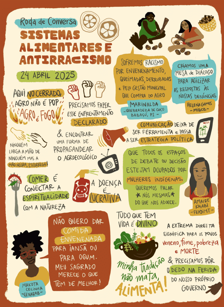 A Roda buscou debater impactos do racismo nos “sistemas alimentares” de povos do Cerrado, abordando soberania e segurança alimentar, produção agroecológica, comida sem veneno, espiritualidade, entre outros.
