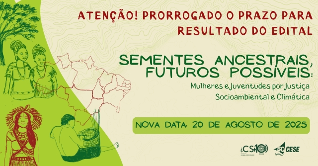 A Coordenadoria Ecumênica de Serviço, CESE, informa que a divulgação do resultado do edital “Sementes Ancestrais, Futuros Possíveis: Mulheres e Juventudes por Justiça Socioambiental e Climática” foi prorrogada para o dia 20 de agosto de 2025.