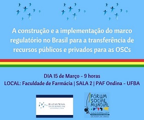 No dia 15/03 (quinta), às 9h30, a Roda de Diálogo “A construção e implementação do Marco Regulatório no Brasil para transferência de recursos públicos e privados para as OSCs” será realizada, com objetivo de estimular a construção e a implementação de marcos regulatórios no Brasil e Equador para a transferência de recursos públicos e privados para as organizações da sociedade civil.