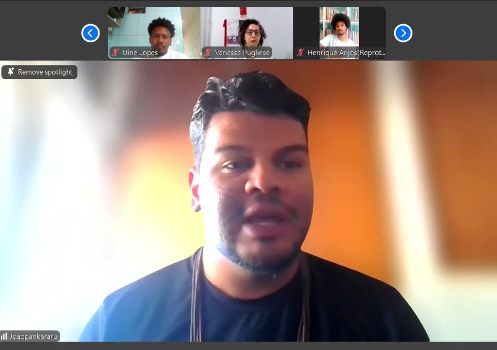 A mediação foi compartilhada entre Uine Lopes (Movimento de Pescadores e Pescadoras Artesanais – MPP, Bahia), João Victor Pankararu (Articulação dos Povos e Organizações Indígenas do Nordeste, Minas Gerais e Espírito Santo – APOINME) e Tamara Cristina Almeida (Coletivo Meraki do Gueto, Ceará). Ao longo do debate, foram expostas denúncias sobre racismo ambiental, impactos das mudanças climáticas na cultura e nos modos de vida, além de críticas a políticas públicas e projetos que ameaçam territórios e comunidades.