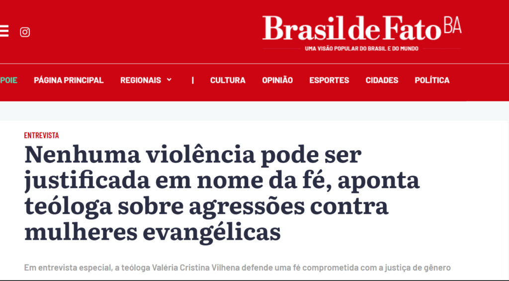 Alinhadas às lutas das mulheres e ao compromisso com os direitos humanos, a Coordenadoria Ecumênica de Serviço (Cese) e o Brasil de Fato Bahia entrevistaram a teóloga feminista Valéria Cristina Vilhena para analisar os dados recentes sobre violência contra mulheres evangélicas e refletir sobre o papel das igrejas nesse cenário.