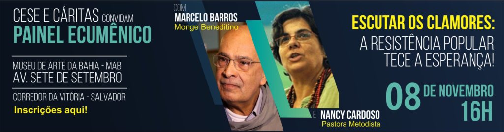 O monge beneditino Marcelo Barros e a pastora metodista Nancy Cardoso se encontram no dia 08 de novembro, às 16h, em Salvador (BA), para o Painel Ecumênico “Escutar os clamores: A resistência popular tece a esperança!”, um momento de reflexão diante dos retrocessos em curso no Brasil. As inscrições para  o evento, que acontece no Museu de Arte da Bahia, podem ser realizadas gratuitamente pelo Sympla.