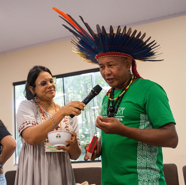 O encerramento do encontro contou com a participação de Toya Manchineri e Gracinha Manchineri, que realizaram a entrega de certificado aos cursistas.