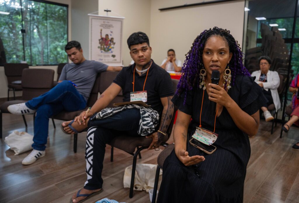 Luara Sapará, da União das Mulheres Indígenas da Amazônia Brasileira – UMIAB, afirmou que a comunicação foi a única forma de fazer o Estado agir em tragédias recentes em Roraima, além de ser vital na denúncia contra os altos índices de feminicídio nas comunidades. Teka Shanenawa alertou que muitas lideranças têm medo de serem filmadas por conta das invasões e sugeriu que as denúncias ganhem nível nacional para blindar quem está na base e solicitou, com urgência, formações em segurança digital.