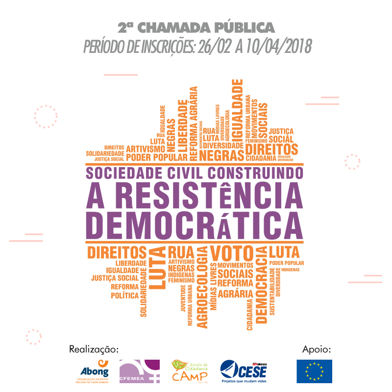 A CESE, a ABONG – Associação Brasileira de Organizações Não Governamentais, o Centro de Assessoria Multiprofissional (CAMP) e o Centro Feminista de Estudos e Assessoria (CFEMEA) prorrogam prazo de divulgação dos projetos habilitados na 2ª Chamada Pública – Projeto Construindo a Resistência Democrática – 2018.
