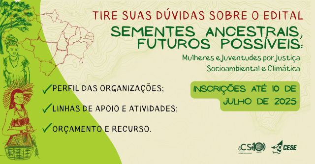 Estão abertas até o dia 10 de julho de 2025 as inscrições para o edital “Sementes Ancestrais, Futuros Possíveis: Mulheres e Juventude por Justiça Socioambiental e Climática”. A chamada, organizada pela Coordenadoria Ecumênica de Serviço (CESE) com o apoio do Instituto Clima e Sociedade (ICS), irá apoiar projetos que dialoguem com a agenda da COP30 e da Cúpula dos Povos e tem como público prioritário mulheres e/ou jovens quilombolas, extrativistas e outros povos e comunidades tradicionais, das regiões Norte, Centro-Oeste e Nordeste do Brasil.